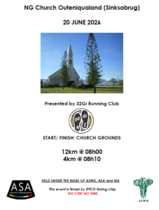 Only athletes that need a temporary licence and the out of province athletes needs a timing chip must register on 06 June from 05h30 – 06h45 in the church hall.