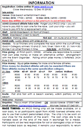 Registration : Online entries @ www.aswd.co.za Close Wednesday 12 December @ 23h30.