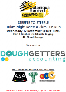 Start & Finish : 18h00 at NG Church, Bergsig, 4th Street, George.