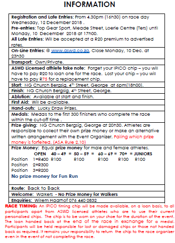 REGISTRATION AND LATE ENTRIES : From 16H30 on race day Wednesday, 12 December 2018.