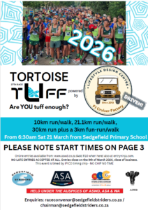 Registration will take place on Friday, 20 March 2026, from 17:00 – 19:00 and Saturday, 21 March 2026, from 5:30 at Sedgefield Primary, corner of Piet my Vrou and Parakiet Street