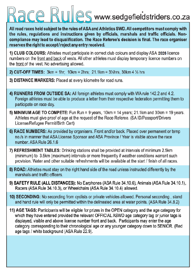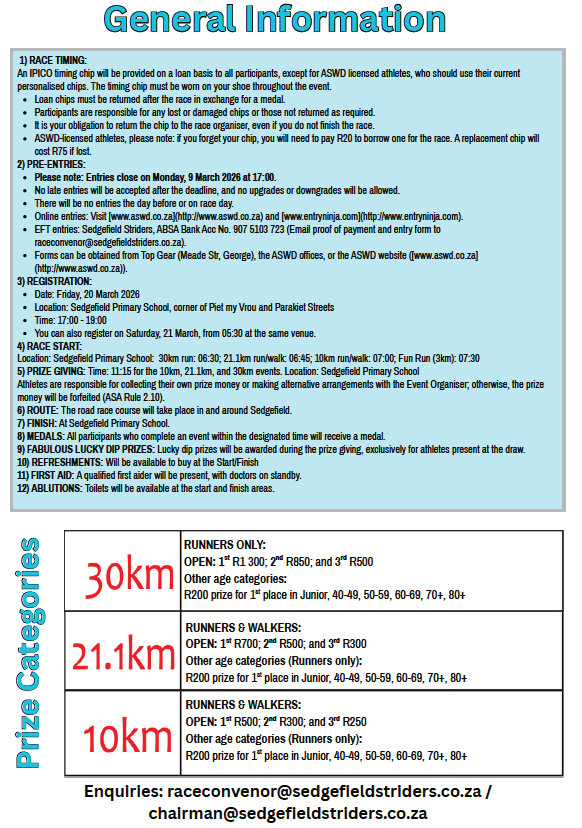 EFT entries: Sedgefield Striders, ABSA Bank Acc No. 907 5103 723 (Email proof of payment and entry form to raceconvenor@sedgefieldstriders.co.za).