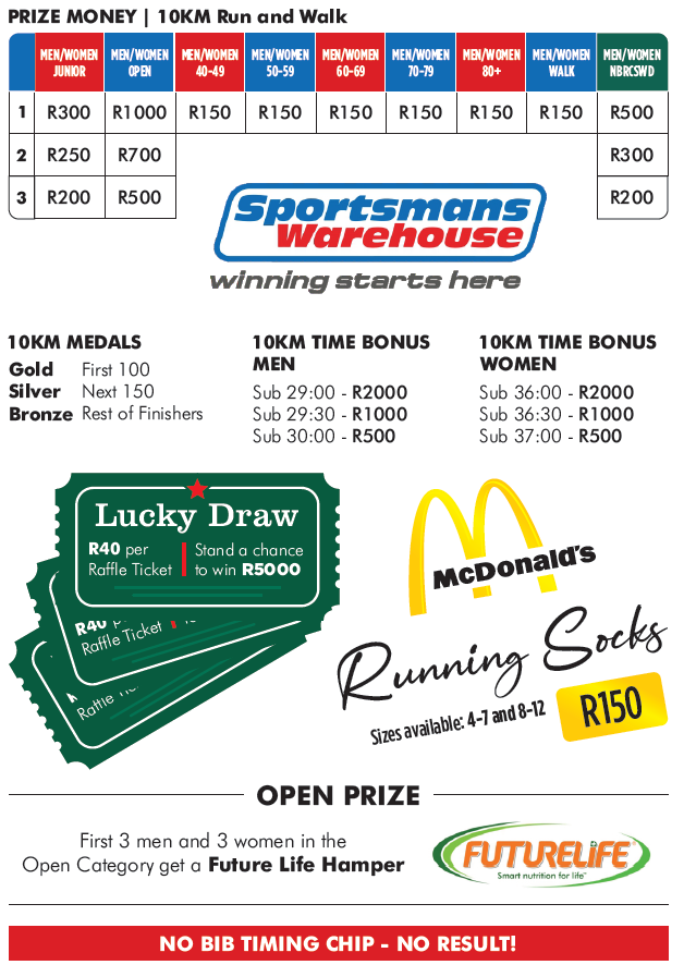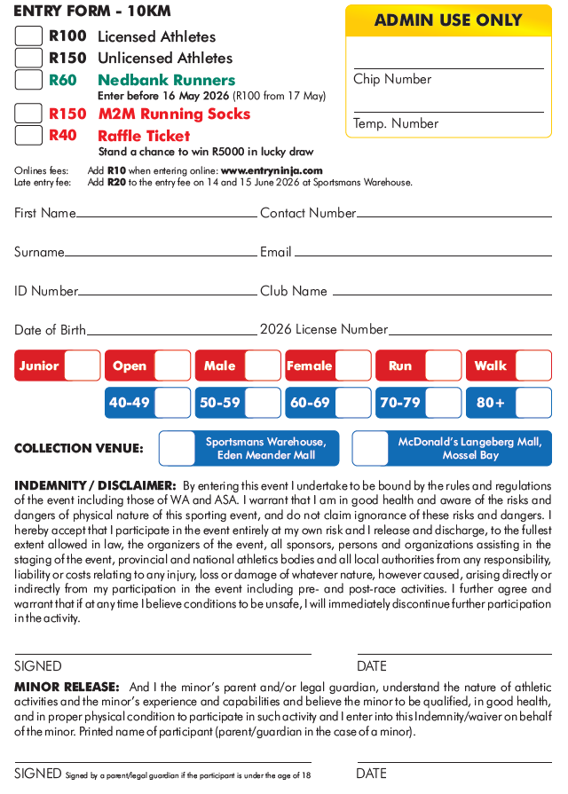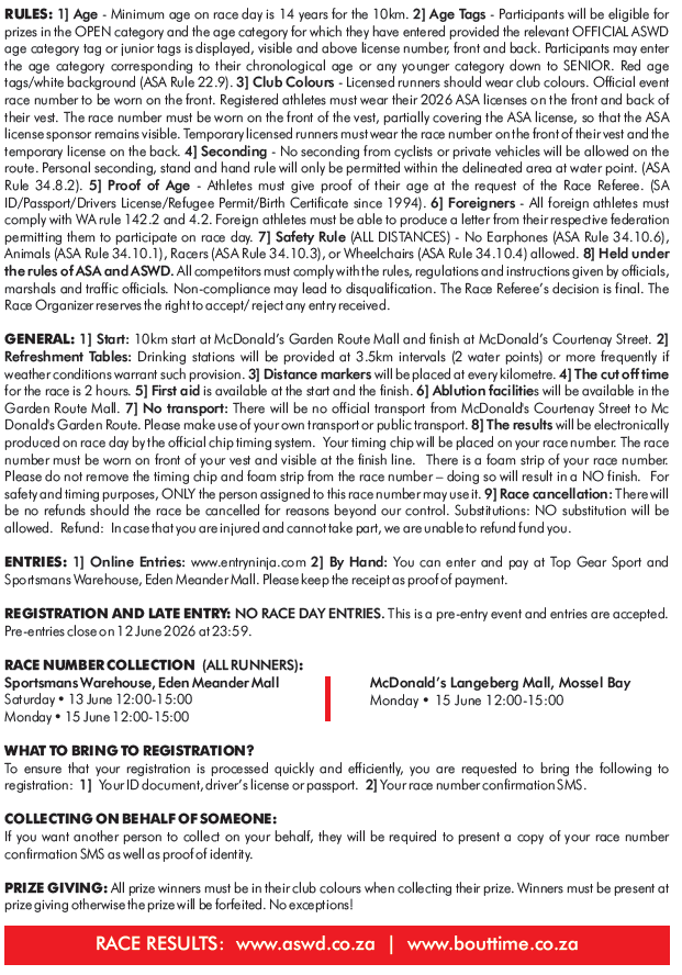 Pre-Entries: Send completed entry form with proof of payment to harriersmbay@gmail.com Dates for submission: 02nd March 2026 till 14th April 2026, 18H00. ABSA Bank Branch: 632005 Current Acc Nr: 2070140902 No late entries for 10km on race day! Only entries for Fun Run on race day. ASWD Licensed athlete take note: Timing will be done