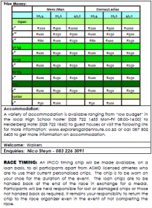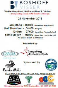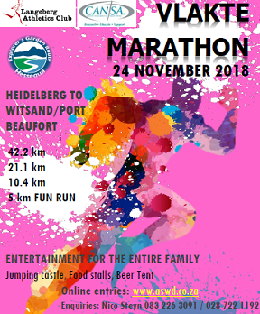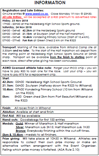 Transport : Morning of the race, available from Witsand Camp site at 3.30am and no later. To the start of the Half Marathon will depart from the starting point at Heidelberg High School Sports Ground at 05h00 sharp. Transport will be available from the finish to starting point of each race, direct after prize giving has been concluded.