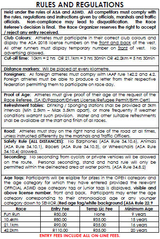 Pre-Entries: Send completed entry form with proof of payment to harriersmbay@gmail.com Dates for submission: 02nd March 2026 till 14th April 2026, 18H00. ABSA Bank Branch: 632005 Current Acc Nr: 2070140902 No late entries for 10km on race day! Only entries for Fun Run on race day. ASWD Licensed athlete take note: Timing will be done